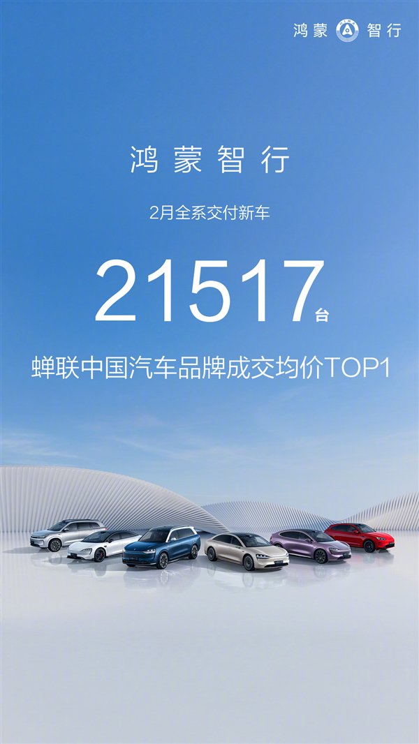 快科技3月1日音讯,在刚刚当年的2月份,鸿蒙智行全系录用21517辆新车,蝉联中国汽车品牌成交均价TOP 1。